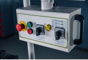 Відповідає європейським нормам. При відкритій кришці відсіку спрацьовує кінцевий вимикач і блокує можливість включення верстата (виділено зеленим). При зміні інструменту шпиндель стопориться спеціальним штоком, одночасно спрацьовує кінцевик (виділено червоним). Це блокує включення верстата із застопореним шпинделем і дозволяє уникнути дорогого ремонту