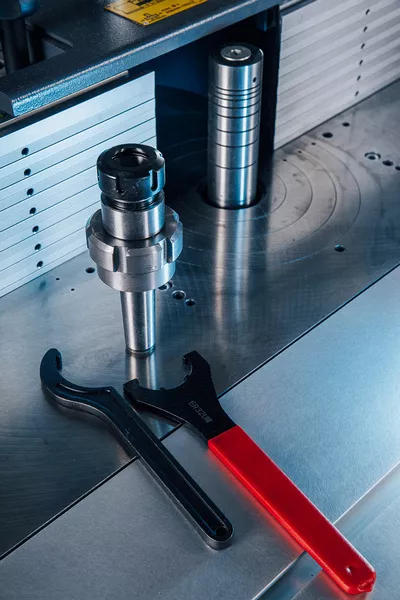 ШПИНДЕЛЬ ПІД КІНЦЕВИЙ ІНСТРУМЕНТ У комплекті з верстатом поставляється шпиндель під кінцевий інструмент із кріпленням під цангу ER32 (цанга та інструмент у комплект поставки не входять). Ключ для знімання шпинделя та ключ для затиску цанг ER32 поставляються в комплекті зі верстатом. |
